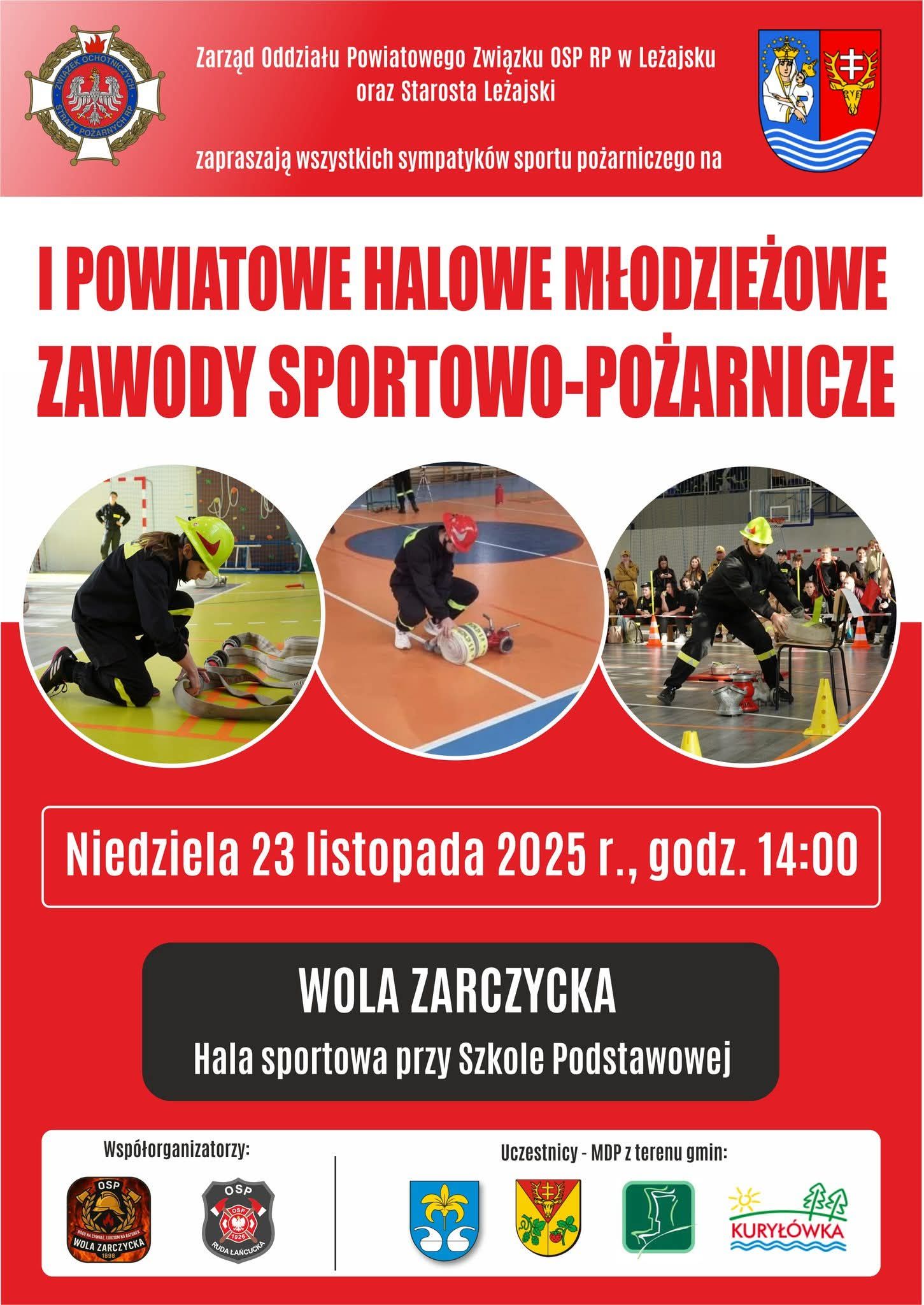 Zarząd Oddziału Powiatowego Związku OSP RP w Leżajsku wraz ze Starostą Leżajskim zapraszają mieszkańców regionu na pierwszą edycję powiatowych halowych zawodów sportowo-pożarniczych, których gospodarzem będzie Wola Zarczycka. Zmagania młodzieżowych drużyn pożarniczych odbędą się w nowoczesnej hali sportowej przy miejscowej szkole, a uczestnikami będą zespoły MDP z gmin Leżajsk, Grodzisko Dolne, Kuryłówka oraz Nowa Sarzyna.