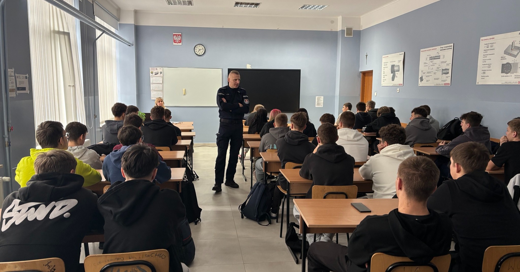 Uczniowie klas drugich Zespołu Szkół Technicznych w Leżajsku uczestniczyli w spotkaniu z funkcjonariuszami Komendy Powiatowej Policji. Rozmawiano o bezpieczeństwie w sieci, odpowiedzialności prawnej młodzieży oraz realiach pracy w służbach mundurowych.