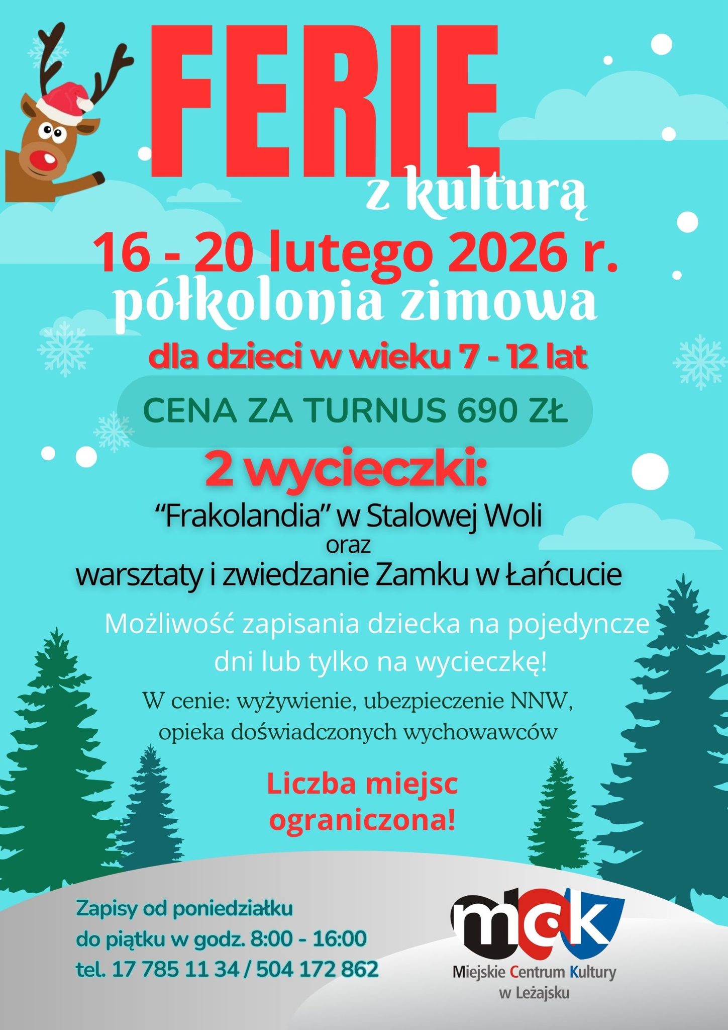 Miejskie Centrum Kultury w Leżajsku zaprasza dzieci w wieku 7–12 lat na zimową półkolonię „Ferie z kulturą 2026”. Turnus odbędzie się w dniach 16–20 lutego i połączy zajęcia artystyczne z wycieczkami.