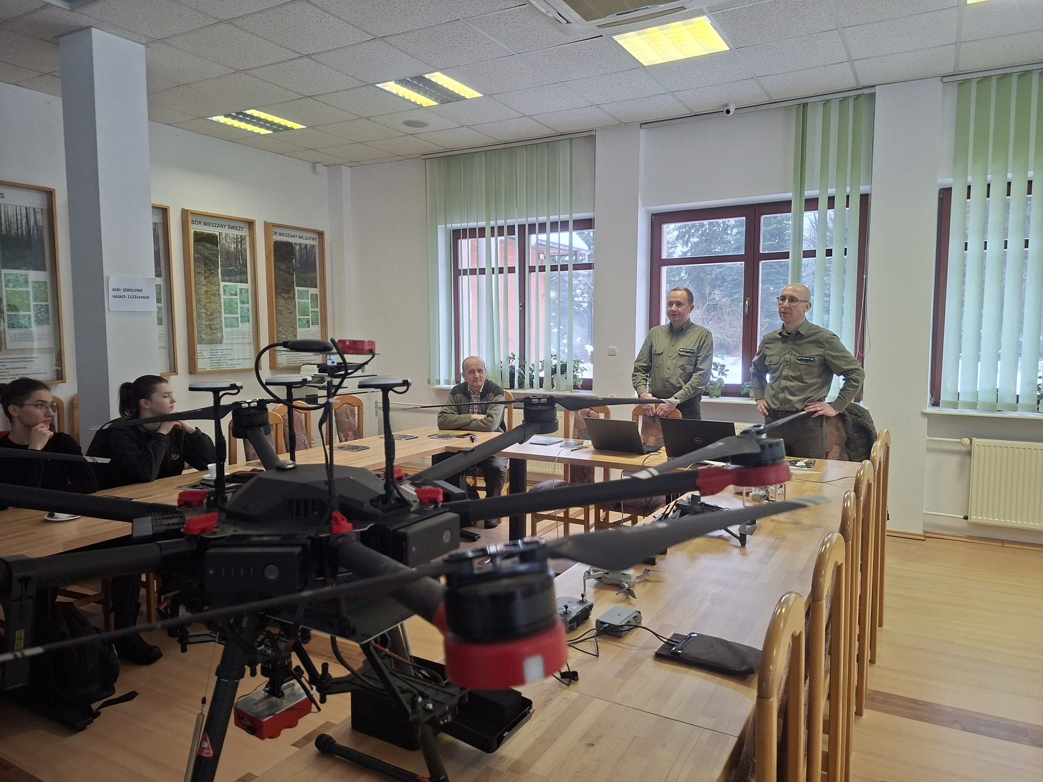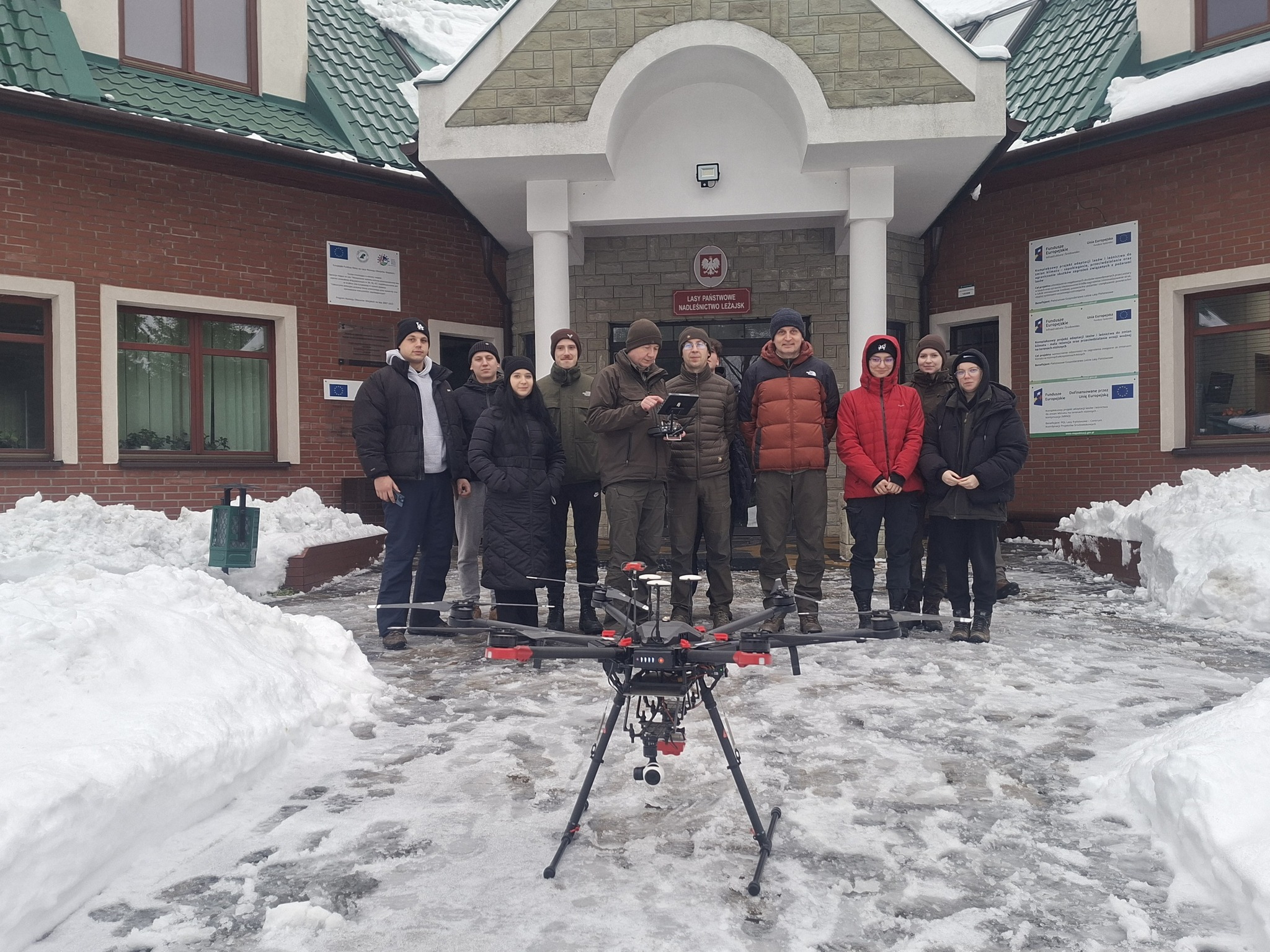 Zajęcia odbyły się 15 stycznia i miały charakter kompleksowego szkolenia łączącego teorię z praktyką. Pod okiem specjalistów z Nadleśnictwa Leżajsk oraz Nadleśnictwa Tuszyma studenci zapoznali się z możliwościami wykorzystania dronów w codziennej pracy leśnika. W trakcie ćwiczeń uczestnicy poznali różne typy sprzętu wykorzystywanego w lotach nad terenami leśnymi – od standardowych kamer RGB po zaawansowane sensory multispektralne, stosowane m.in. do oceny kondycji drzewostanów. Omówiono również aktualne przepisy lotnicze oraz zasady bezpiecznego planowania i realizacji misji z użyciem BSP.
