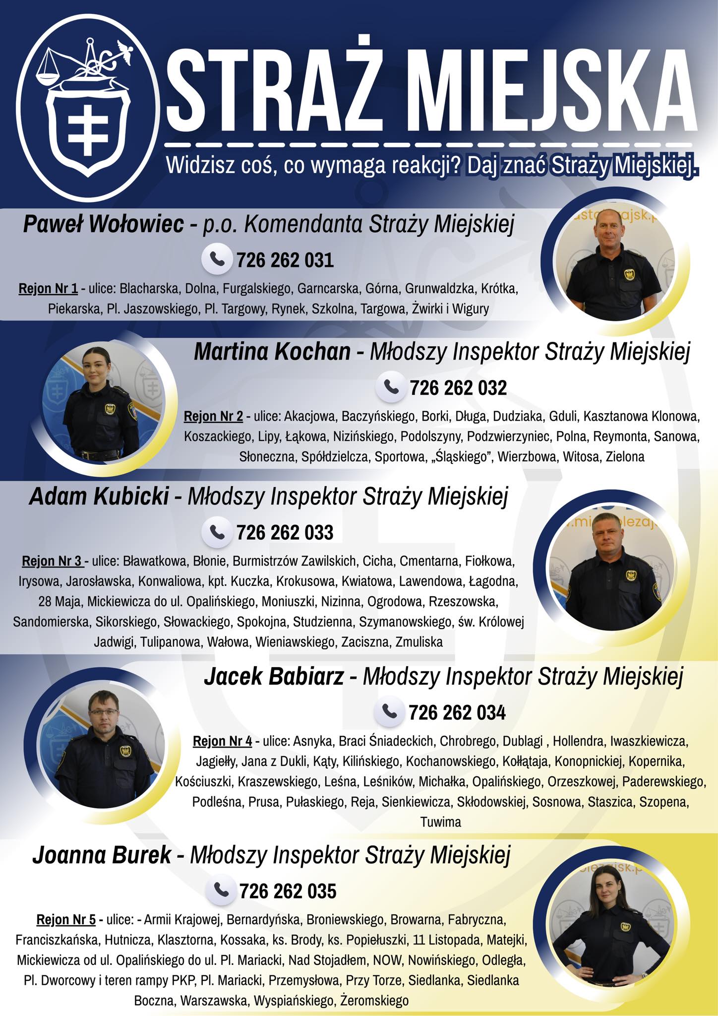 Dla usprawnienia kontaktu z mieszkańcami, Straż Miejska przypomina o aktualnym podziale miasta na rejony służbowe. Każdy z funkcjonariuszy jest przypisany do konkretnego obszaru, co ma ułatwić zgłaszanie interwencji oraz budowanie relacji z sąsiedztwem.