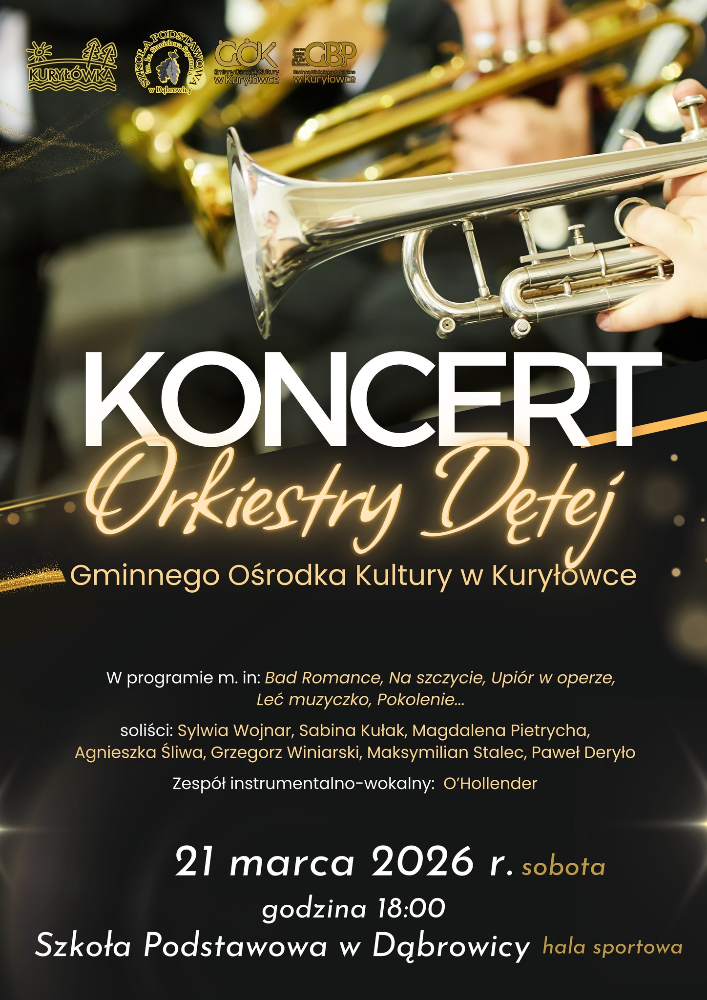 Program zaplanowany na ten wieczór jest bardzo bogaty i różnorodny. Orkiestra Dęta GOK w Kuryłówce wykona zestaw utworów, nad którymi pracowała przez ostatnie miesiące. Na liście znajdują się popularne kompozycje, takie jak „Bad Romance”, „Na szczycie” czy klasyczny „Upiór w operze”. Nie zabraknie również polskich akcentów w postaci utworów „Leć muzyczko” oraz „Pokolenie”. Obok orkiestry na scenie zaprezentuje się liczna grupa solistów, w tym Sylwia Wojnar, Sabina Kułak, Magdalena Pietrycha, Agnieszka Śliwa, Grzegorz Winiarski, Maksymilian Stalec oraz Paweł Deryło. Podczas tego wieczoru wystąpi także zespół instrumentalno-wokalnego O’Hollender. Całość potrwa około godziny i będzie okazją do zaprezentowania owoców współpracy lokalnych muzyków z ośrodkiem kultury. Wydarzenie ma charakter otwarty, a organizatorzy liczą na to, że tegoroczna frekwencja pobije zeszłoroczny wynik 280 widzów. Przygotowany repertuar ma trafić w gusta osób w każdym wieku, łącząc energię instrumentów dętych z talentem zaproszonych wokalistów.