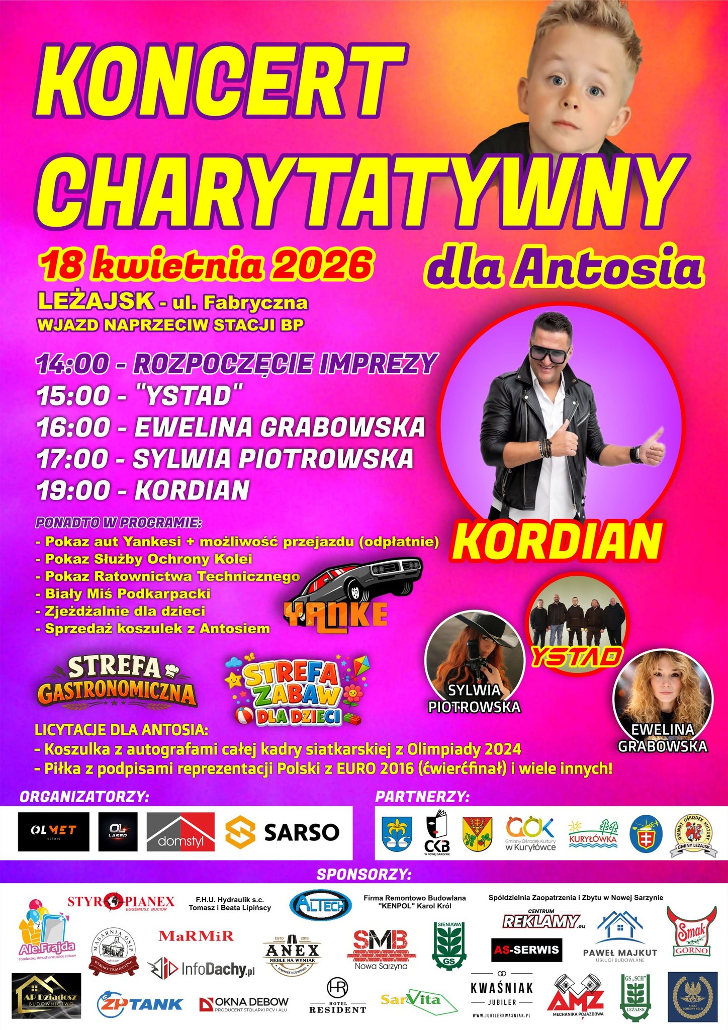 W sobotę, 18 kwietnia w Leżajsku odbędzie się koncert charytatywny, z którego całkowity dochód zostanie przeznaczony na pomoc dla małego Antosia. Organizatorzy przygotowali bogaty program artystyczny oraz liczne atrakcje towarzyszące, które gwarantują udane popołudnie dla całych rodzin.